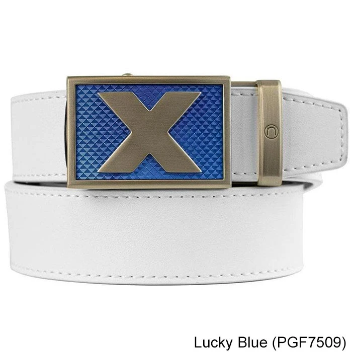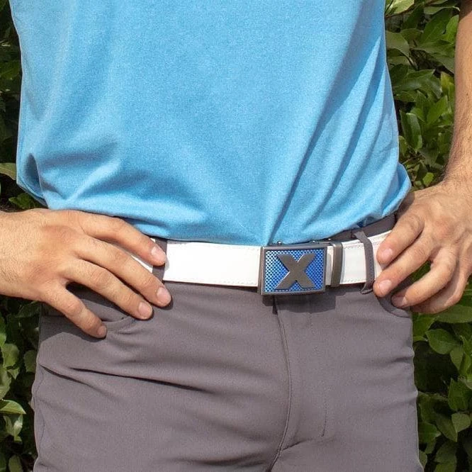 - Ratchet golf belt with a white leather strap and stitching